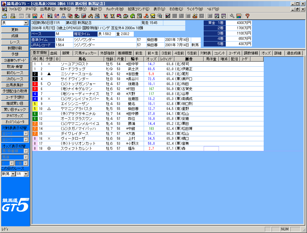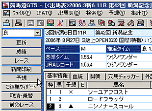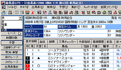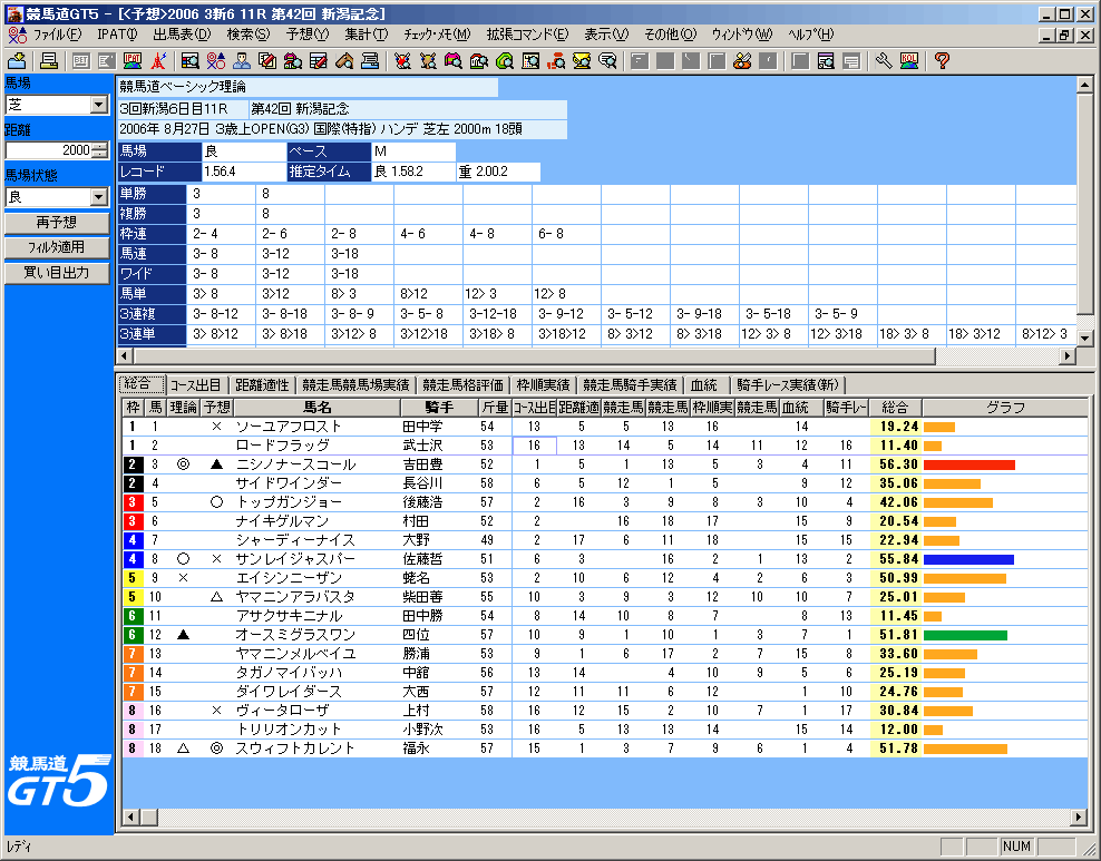 理論の予想結果である[理論]が一番左に、次の[予想]は競馬ブックの予想印(*東は松本憲二氏・西は中野秀幸氏)、予想理論の項目の各順位、総合ポイント、ポイントをグラフ化したものが表示されます。[グラフ]の部分や、[理論]の部分をクリックすれば、ソートできます。なお、成績データを登録している場合は一番右に着順が表示されます。