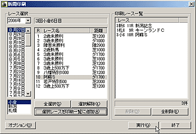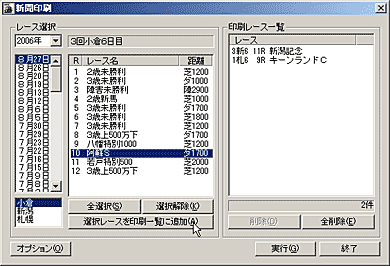 ここで、新聞印刷を行なうレースを選択し、[選択レースを印刷一覧に追加]をクリックします。画面右の[印刷レース一覧]に、印刷したいレースが表示されます。