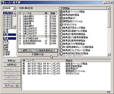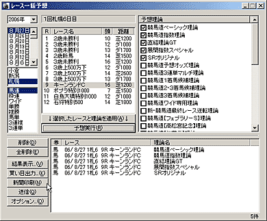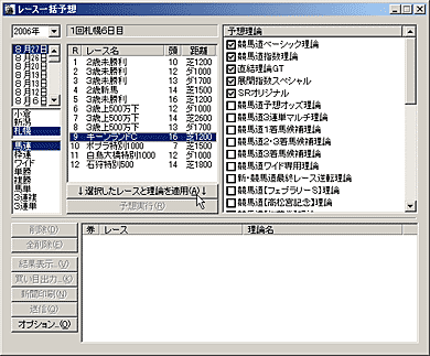 複数の予想印を印刷するためには、2の手順で、同じレース(例えば阿蘇S)に対して複数の予想理論を組み合わせて[適用レース]のボックスに入力していきます。5レース分の新聞が印刷されるように見えてはいますが、同じ[レース]については1つの馬柱にまとめて印刷されます。