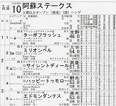 印刷された新聞の予想印は、横組みの場合一番左が競馬ブックの予想印で、その右隣から5つが予想理論による印となります(下画像参照)。