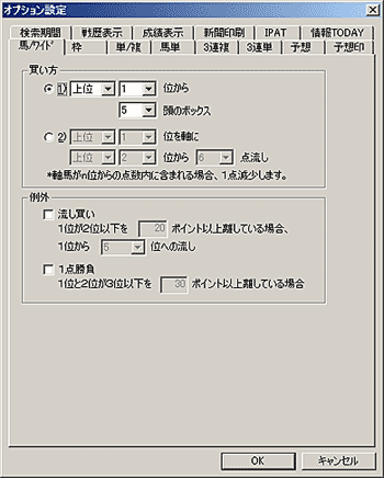 なお、馬連・ワイド、枠連、馬単、3連複は予想結果のポイントの差による流し買いや、1点勝負にする例外設定が可能です。