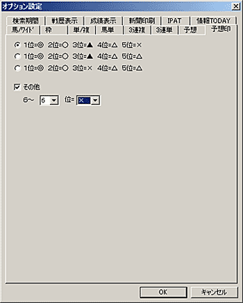 予想結果画面には予想印と、各馬券種別の買い目が表示されます。その設定をしておきましょう。