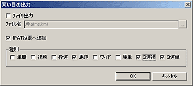 予想結果の買い目をIPAT投票の買い目に転送する場合は、予想結果画面の拡張ボックス[買い目出力]をクリックしてください。次に買い目の出力画面が表示されます。[IPAT投票へ追加]にチェックが入っていることを確認したら、購入しない馬券種別のチェックを外し、OKを押してください。