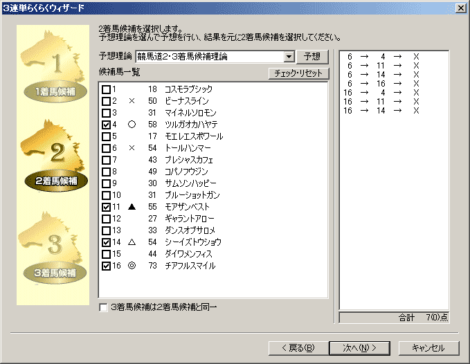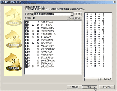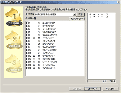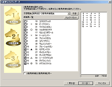 この3連単らくらくウィザードを使えば、1着馬候補→2着馬候補(2・3着馬候補)→3着馬候補と順を追って予想ができますので3連単予想の精度はより高くなるといえるでしょう。