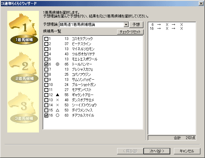 1着馬候補を選ぶために使用する予想理論を選択します。画面では◎トールハンマーと○チアフルスマイルを1着馬候補とし、チェックボックスにチェックを入れました。よろしければ[次へ]をクリックしてください。