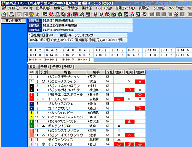 - 3連単らくらくウィザードによる予想結果です。画面左上に1着・2着・3着それぞれに利用した理論が、その下に買い目が表示されます。画面下には適用した理論による予想印が表示されます。1着馬候補〜3着馬候補に指定した馬は、予想印が赤地に白ヌキ文字で表記されます。