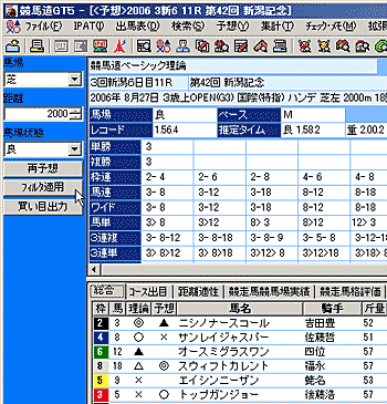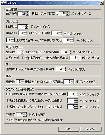 休養明けや初芝・初ダート、降級などの条件のときに予想理論で予想した結果にフィルタをかけることができます。この機能を『予想フィルタ』と呼びます。フィルタを設定、編集をしましょう。