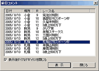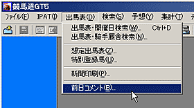 競馬道GT5を購入いただいた方限定でダウンロードできるのが「前日コメント」です。[出馬表]メニューから[前日コメント]を選択します(左上画面)。[前日コメント]ダイアログ(左下画面)で、検索したいレースを選択し、[表示]をクリックすると前日コメント(下画面)が表示されます。