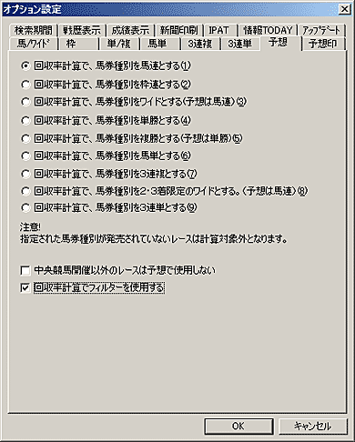 回収率計算や予想理論構築、一括予想で前もって予想フィルタをかけておきたい場合はそれぞれのオプション設定で、[回収率計算でフィルタをかける]にチェックを入れておきましょう。