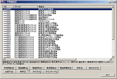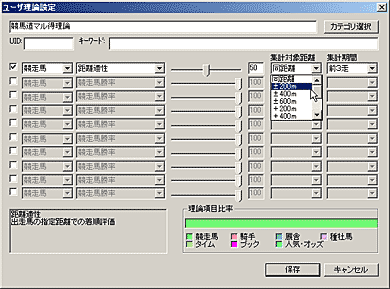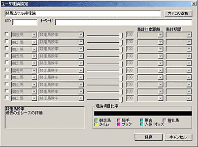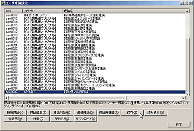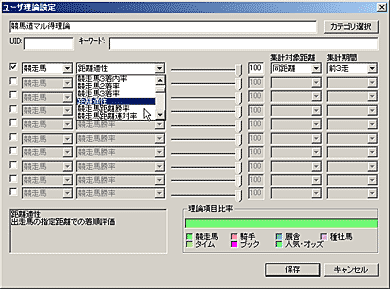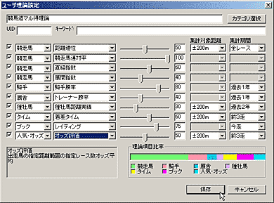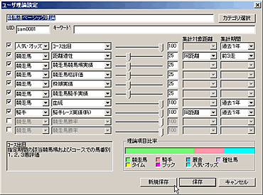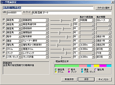競馬道GT5の予想理論で利用できる予想項目は多岐にわたり、この組み合わせによって、様々な予想理論を作成することができます。しかし、新たに理論を作成する場合、選択した予想項目の種類やウエイトの調整度合によっては、その予想結果があまり芳しくないケースも考えられます。そこで、最初は既にある予想理論にアレンジを加えて利用してみるのもひとつの方法です。例えば[予想]〜[ユーザ理論の設定]画面を開き、「競馬道ベーシック理論」を選択した状態で[理論編集]をクリック、[新規保存]をクリックすると「競馬道ベーシック理論」が作成されます。これを選択して[編集]をクリックすれば、作成した「競馬道ベーシック理論」の内容が表示され、各項目の調整ができるようになります。