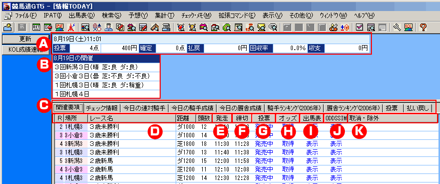 | A:当日の収支 | レース当日の投票点数と総金額、確定レース数、払戻金額、回収率、収支を掲載します。 |