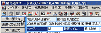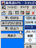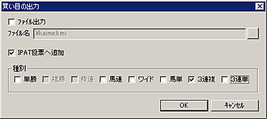 拡張ボックスの〔買い目出力〕ボタンをクリックすると、〔買い目の出力〕画面が表示されます。ここで購入する馬券種を選択します。IPAT投票へ追加にチェックを入れると、IPAT投票画面に追加されます。上のファイル出力にチェックを入れると、買い目の読み込み用ファイル(情報TODAYを別プロセスで起動した場合、GT5本体メニューIPAT→[買い目ファイルの読み込み]からも読み込み可能)として利用できます。