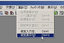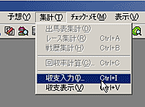 馬券の買い目と購入金額を入力するには、メインメニューの[集計]から[収支入力]を選択、またはツールバーのアイコンを選択し、[収支入力]のウインドウを開きます。