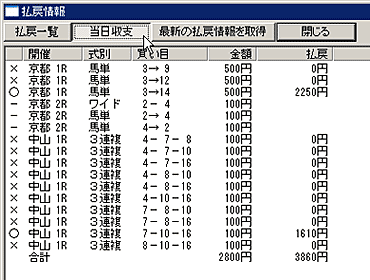 ウインドウ上部には、年度指定欄と各種の集計値が表示されます。集計項目は左から、総購入額/払戻金合計、的中レース/不的中レース、回収率/的中率で、これらの数字はいずれも指定年度内での集計結果です。