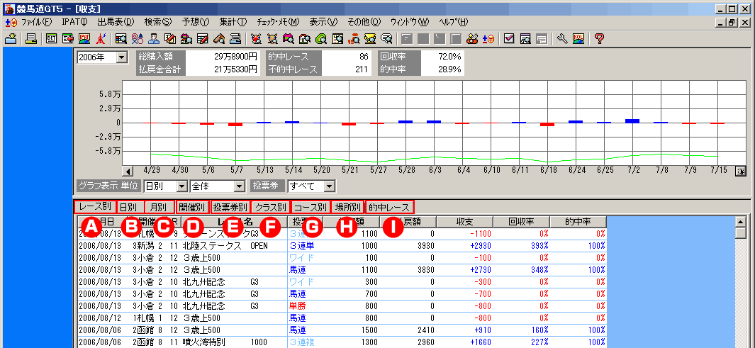 A〜Iの表示内容はグラフと連動しています。グラフの[投票券]種別が「すべて」の時は、全種別についての集計結果が表示されます。グラフの表示が「単勝」「ワイド」などを指定している場合は、タブ部分の表示内容も[投票券]種別ごとの集計となります。