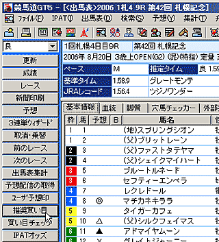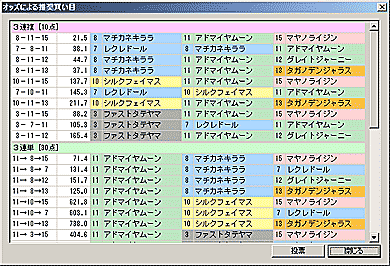 過去のデータから出走頭数、単勝1番人気のオッズ倍率、単勝1番人気と2番人気とのオッズ差により、推奨する3連単(30点)・3連複(10点)の買い目を表示します。IPAT投票にも買い目を転送できます。