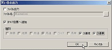 まず、推奨買い目の画面の[投票]ボタンをクリックします。買い目の出力画面が出てきますので、IPAT投票へ追加にチェックボックスを入れ、購入する馬券種(3連複・3連単)を選び[OK]を押してください。