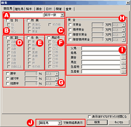 | J:検索結果表示 | 検索結果表示形式を選択します。例えば「種牡馬」を選択すると検索設定条件に該当する競走馬の種牡馬データを表示することができます。 |