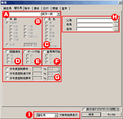 | I:検索結果表示 | 検索結果表示形式を選択します。 例えば検索結果を「戦歴」に設定すると、当該種牡馬の産駒戦歴が表示されます。 |