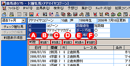 | C:戦績2タブ | 距離別の着度数、勝率、連対率、2着率などが表示されます。コース(芝・ダート)および右回り・左回り別に一覧できます。 |