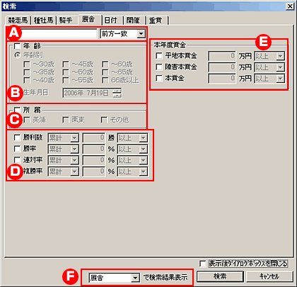 | F:検索結果表示 | 検索結果表示形式を選択します。 例えば検索結果を「騎手」に設定すると、当該厩舎の所属馬に騎乗したすべての騎手が表示されます。 |