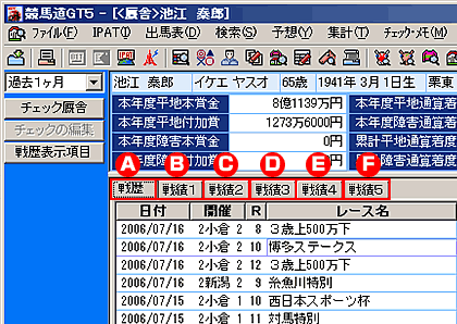 | A:戦歴タブ | 該当する厩舎の競走馬が出走した過去のレースデータを一覧することができます。一覧表の上にある各項目欄をクリックすれば、一覧表を昇順や降順で並び替えを行なうことができます。 また、項目欄の文字が太字表示になっている各項(カーソルが手のマークになる)をクリックすると、各レースの「成績表示」、さらには「競走馬」「騎手」の検索結果情報が表示されます。 |