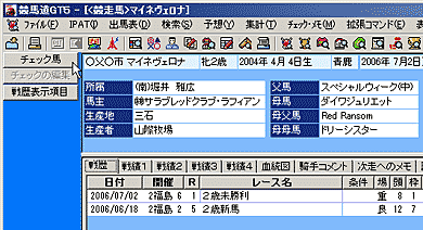 - チェックしたい競走馬の画面を表示して、メインメニューの[拡張コマンド]から[チェック]を選択するか、[拡張ボックス]の[チェック馬]にチェックを入れます。種牡馬、騎手、調教師についても同様にチェックすることができます。