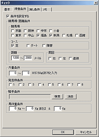 - 続いて[得意条件]タブをクリックして、その馬の得意条件を設定します。まずウインドウ左上の[条件を設定する]にチェックを入れ、[競馬場・距離条件]や[周回]などを設定します。同様に[消し条件]タブの内容も設定します。数値を入力する項目に条件を設定しない場合は、範囲を[0〜0]に指定します。なお、[メモ]もこの画面から[メモ]タブを選択すれば編集可能です。
