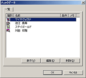 [分類]や[得意条件][消し条件]は設定しなくても、チェックデータに登録されていれば、出馬表で反転表示されます。また、一度登録したチェックデータの編集は、[拡張コマンド]メニューから[チェックの編集]を選択する他に、メインメニューの[チェック・メモ]から[チェックデータ表示]を選択しても可能です。なお、チェックデータを削除する場合は、この[チェックデータ表示]から行なってください。
