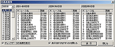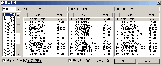 メインメニューの[出馬表]から[出馬表・開催日検索]を選択し、[出馬表検索]ウインドウを開きます。[チェックデータの有無を表示]という項目にチェックを入れると、チェックデータの組合せによって1〜15までの数字が表示されます。