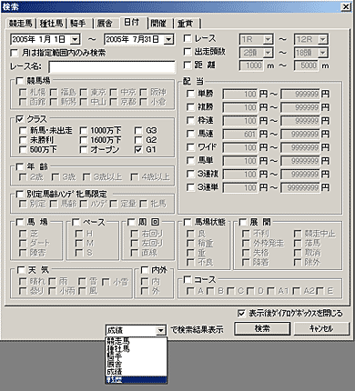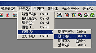 - 「戦歴集計」機能を使うためには、あらかじめ戦歴検索を行なう必要があります。メインメニュー[検索]から[競走馬][種牡馬][騎手][厩舎]または成績検索の[日付][開催][重賞]のいずれか一項目を選択し、[検索]ウインドウを開きます。