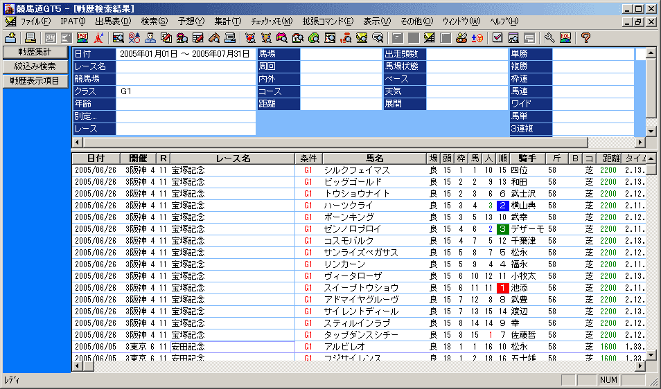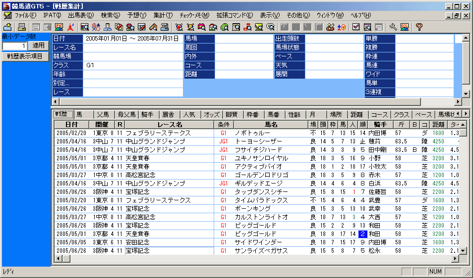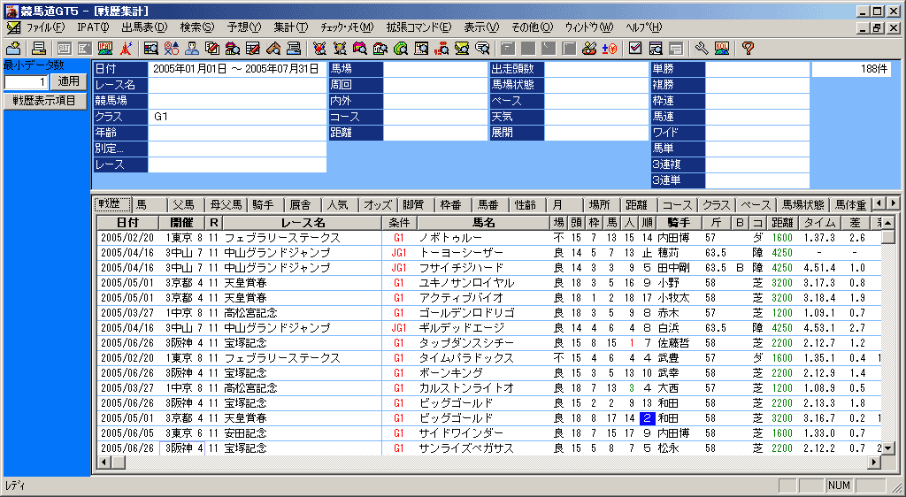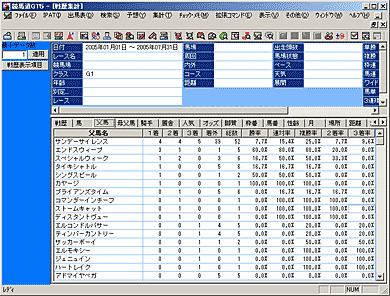 指定した検索条件に当てはまる全レースの情報(戦歴)を集計する機能です。種牡馬や騎手から検索すればそれぞれが得意なコースや条件を、逆にコースや距離から集計すれば、その条件が得意な種牡馬や騎手を知ることができます。