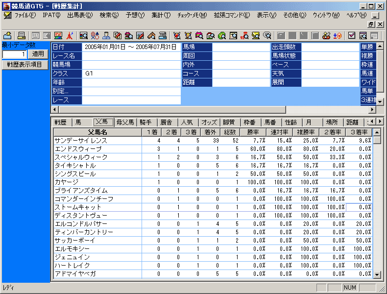 「最小データ数」とは統計により正確な結果を得るために、数の少ないデータを除外する機能です。例えば競走馬を一頭しか輩出していない種牡馬の産駒が、1回だけ出走し優勝した場合、「戦歴集計」データで「父馬」項目の「勝率」「連対率」「複勝率」が100%になり、戦歴データの1番上に表示されることになります。