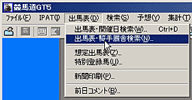 - 競馬道GT5では、指定した日の騎手の騎乗馬一覧や、厩舎の出走馬一覧から出馬表を表示する[出馬表・騎手厩舎検索]ができます。まず、メインメニューの[出馬表]から[出馬表・騎手厩舎検索]を選択します。