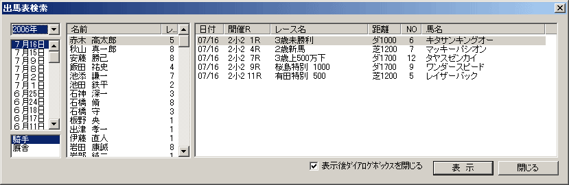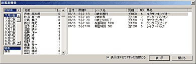 - [出馬表検索]のウインドウ左側の[開催年][開催日]と、[騎手]または[厩舎]を選択すると、中央に騎手(厩舎)の一覧が表示されます。ここで騎乗馬(出走馬)一覧を表示させたい騎手(厩舎)を選択してください。右側に指定した日の騎乗馬(出走馬)一覧が表示されますので、出馬表を表示したいレースを選択して[表示]ボタンをクリックすると、選択したレースの出馬表が表示されます。