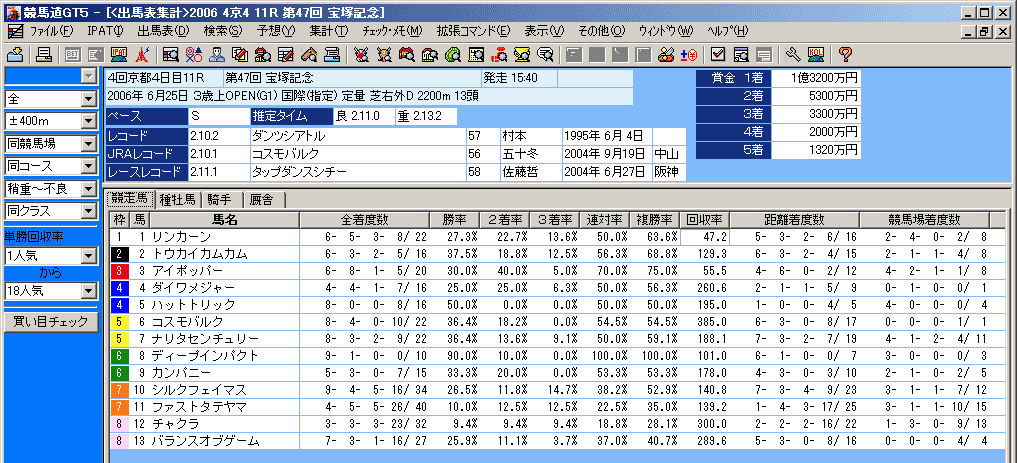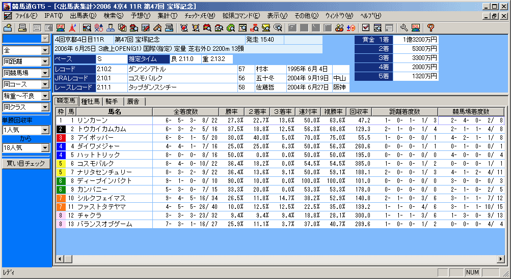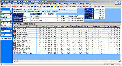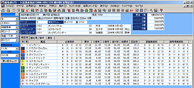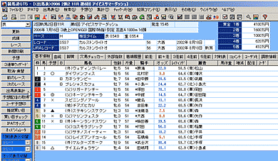 画面上部には、[出馬表集計]を行なったレースのレース名、条件などが表示されます。また、画面下部には出馬表集計の結果が表示されます。表示する集計結果は[競走馬][種牡馬][騎手][厩舎]のタブをクリックして切り替えます。