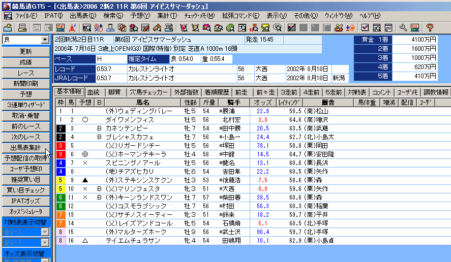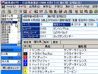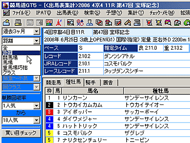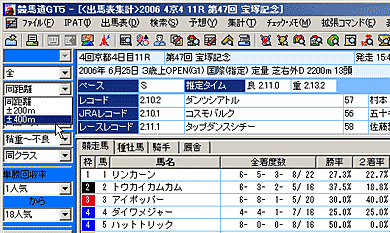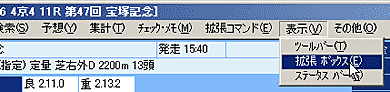 [出馬表集計]機能の利用はもちろん、競馬道GT5では、[拡張ボックス]を表示しておくと、様々な操作を簡単に行なうことができます。インストール時の設定を変更していなければ、[拡張ボックス]は画面左に表示されています。表示されていない場合は、メニューの[表示]から[拡張ボックス]をクリックすれば表示されるようになります。