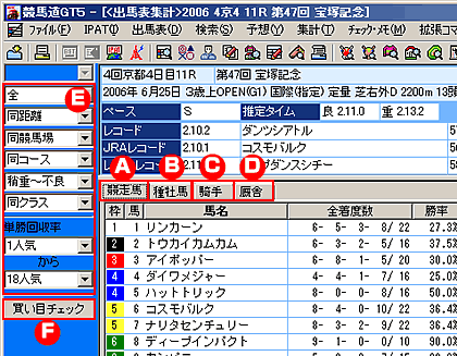 | F:買い目チェック | 出馬表集計結果画面で買い目チェックを行なうことができます。買い目チェックについては該当のページをご覧ください。 |