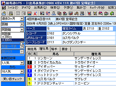 | C:騎手タブ | 出馬表集計を行なったレースに騎乗している騎手に関する集計データを表示します。表示できる集計データは[距離][競馬場][馬場][重馬場巧拙][クラス][同競走馬][同厩舎]の7種類で、[拡張コマンド]から切り替えます。表示される内容は着度数、勝率、連対率、複勝率、2着率、3着率、単勝回収率です。 |