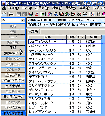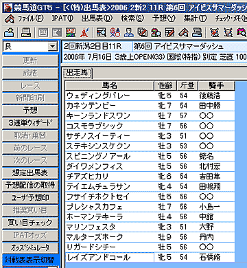 - 特別登録馬の一覧画面では、通常の出馬表表示画面と同様に、予想理論を利用して予想を行なうことができます。それぞれ[拡張コマンド]から[予想]を選択します。