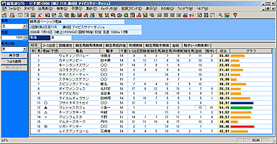 - 指定したレースの特別登録馬一覧です。[馬名]の他に[性齢][斤量][騎手]が表示されます。騎手は想定のため、未定の場合は[○○]と表示されます。ここで馬名や騎手をクリックすると、それぞれに対応した競走馬画面や騎手画面が別ウインドウに表示されます。ただし中央初出走の地方所属馬など、競走馬データがないものについてはデータが表示されません。またハンデ戦は斤量が未定のため、すべて0と表示されます。