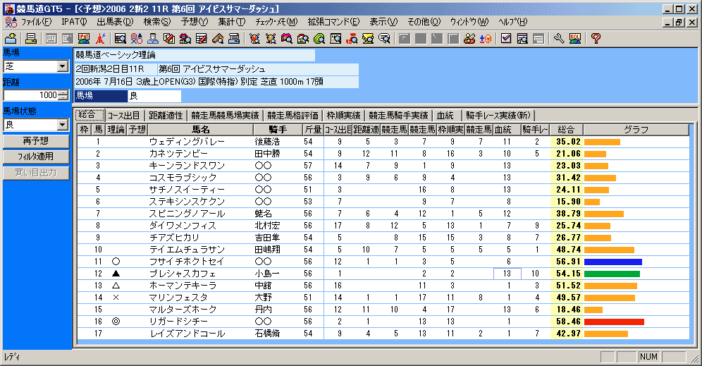 - [競馬道ベーシック理論]を適用して予想を行なった画面です。特別登録馬データから予想をした画面における操作は、通常の出馬表から予想をした場合と同様です。なお、予想の制限頭数は99頭までとなっており、33頭以上の多頭数で予想を行なおうとした場合は[多頭数の予想には実行に時間がかかる場合があります。続行しますか?]という確認のダイアログが表示されます。