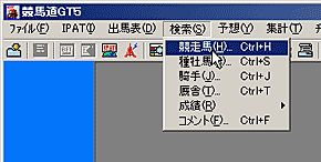 - メインメニューの[検索]から、検索したいデータを指定します(画面は競走馬を検索する例です)。[成績]を検索する場合は、[成績]を選択し、さらに[開催日][日付][開催][重賞]のいずれかを選択します。