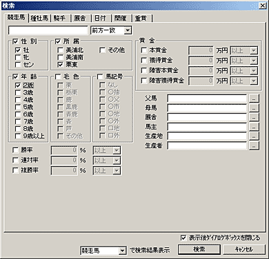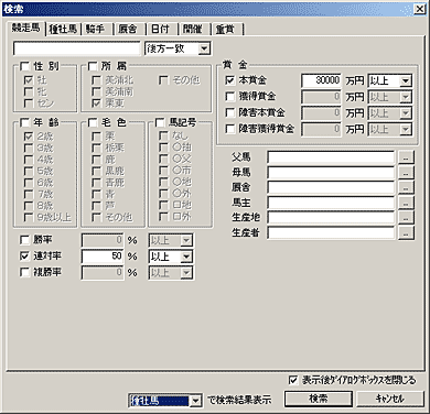 1)競走馬検索から、賞金、連対率の設定を行ないます。