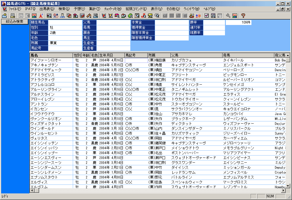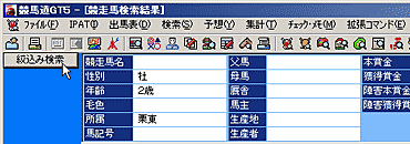 - 検索結果が表示された画面です(画面は競走馬の場合)。この画面で、検索したデータに応じて競走馬名や種牡馬名、騎手名等をクリックすると、それぞれの詳細データが表示されます。なお、さらに条件を絞り込んで検索し直したい場合は、[拡張ボックス]から[絞込み検索]を実行します(前ページ「アドバイス」参照)。