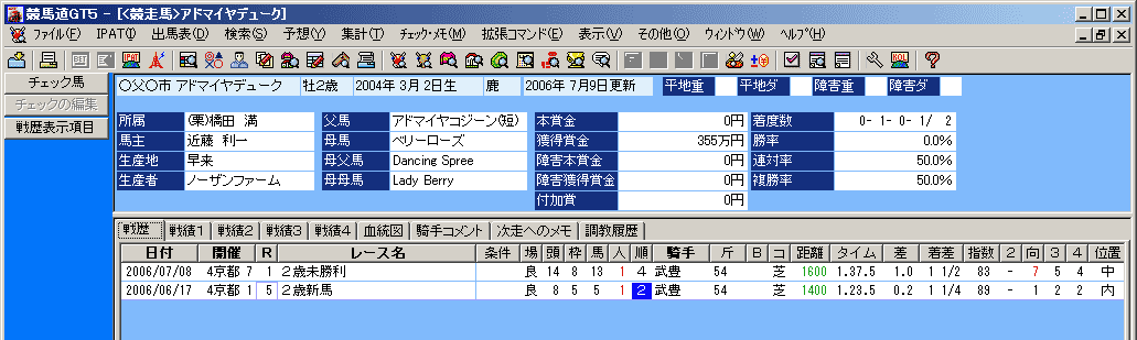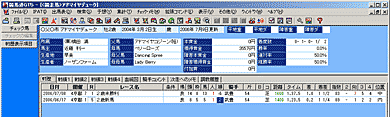 - 手順3の画面で競走馬名をクリックして、競走馬画面を表示させた例です。手順1で種牡馬から検索した場合は種牡馬画面が、騎手で検索した場合は騎手画面が開きます。各画面の見方については次ページ以降で解説していますので、詳細はそちらをご覧ください。